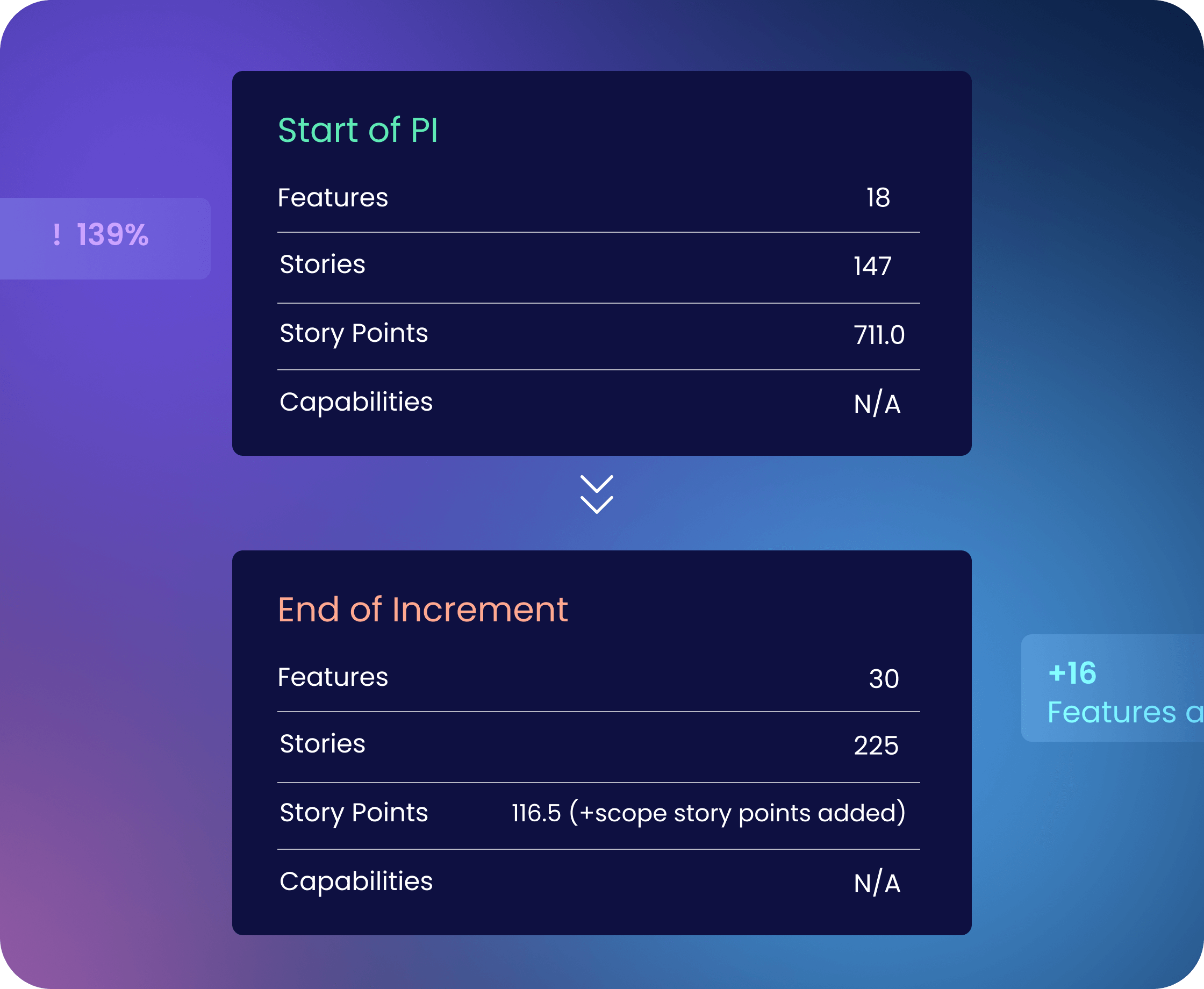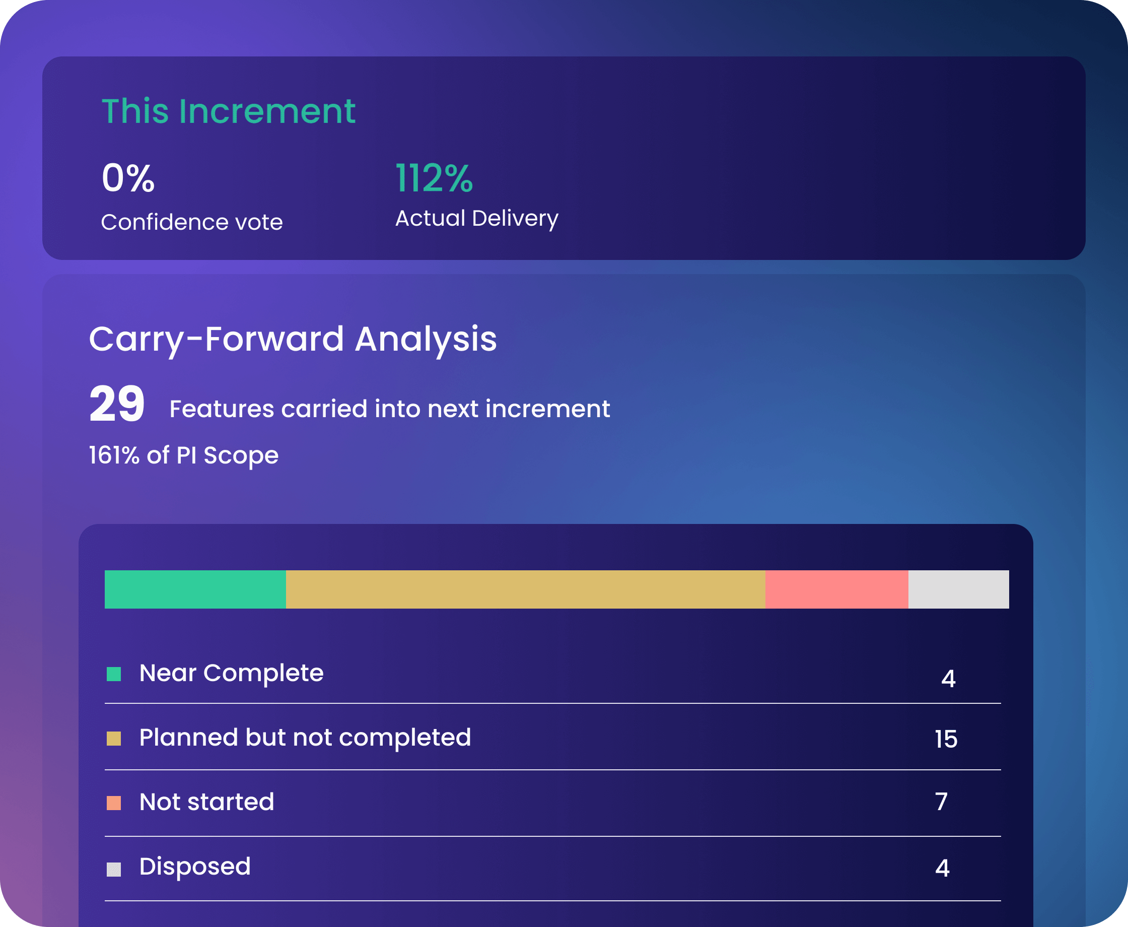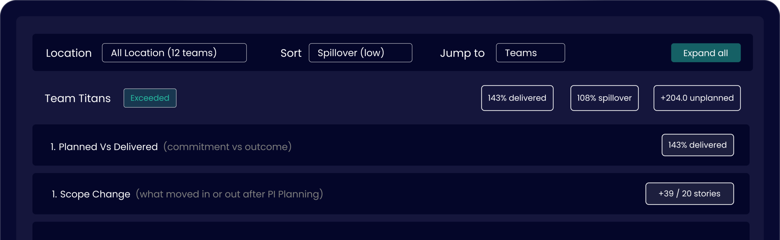 commitment. Reveals whether teams over- or under-delivered. And surfaces under-utilized teams to rebalance next PI.