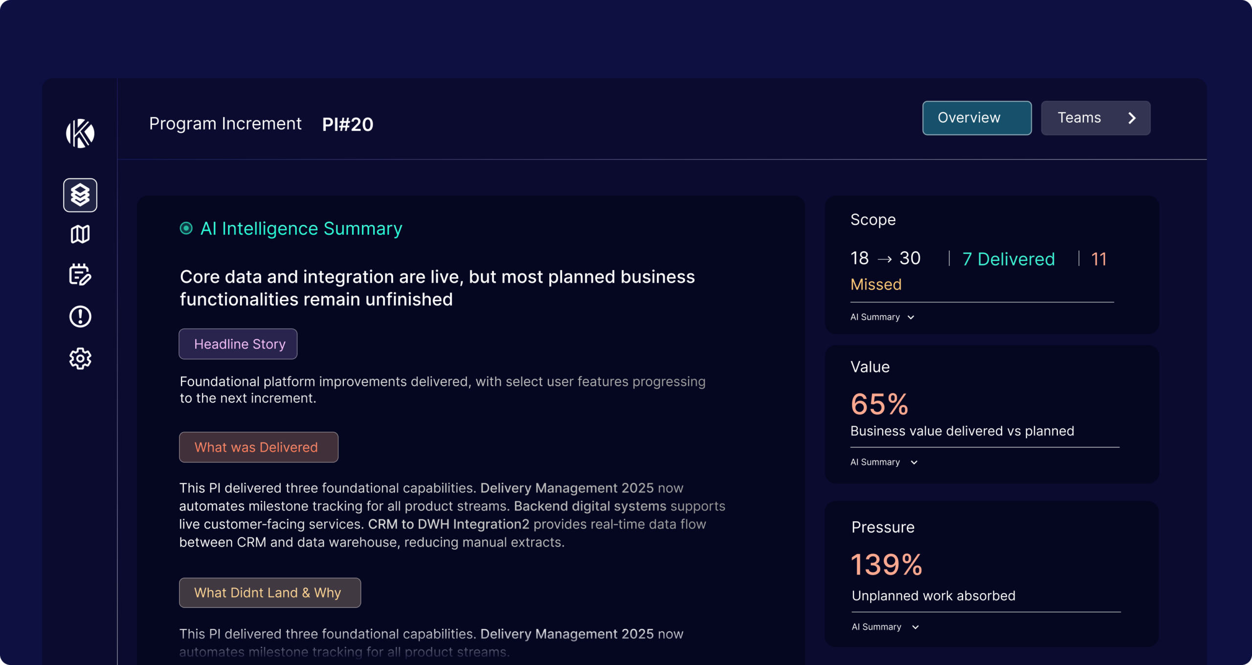 Transform complex PI data into executive-ready insights with a single, actionable narrative for leadership, product, and delivery teams