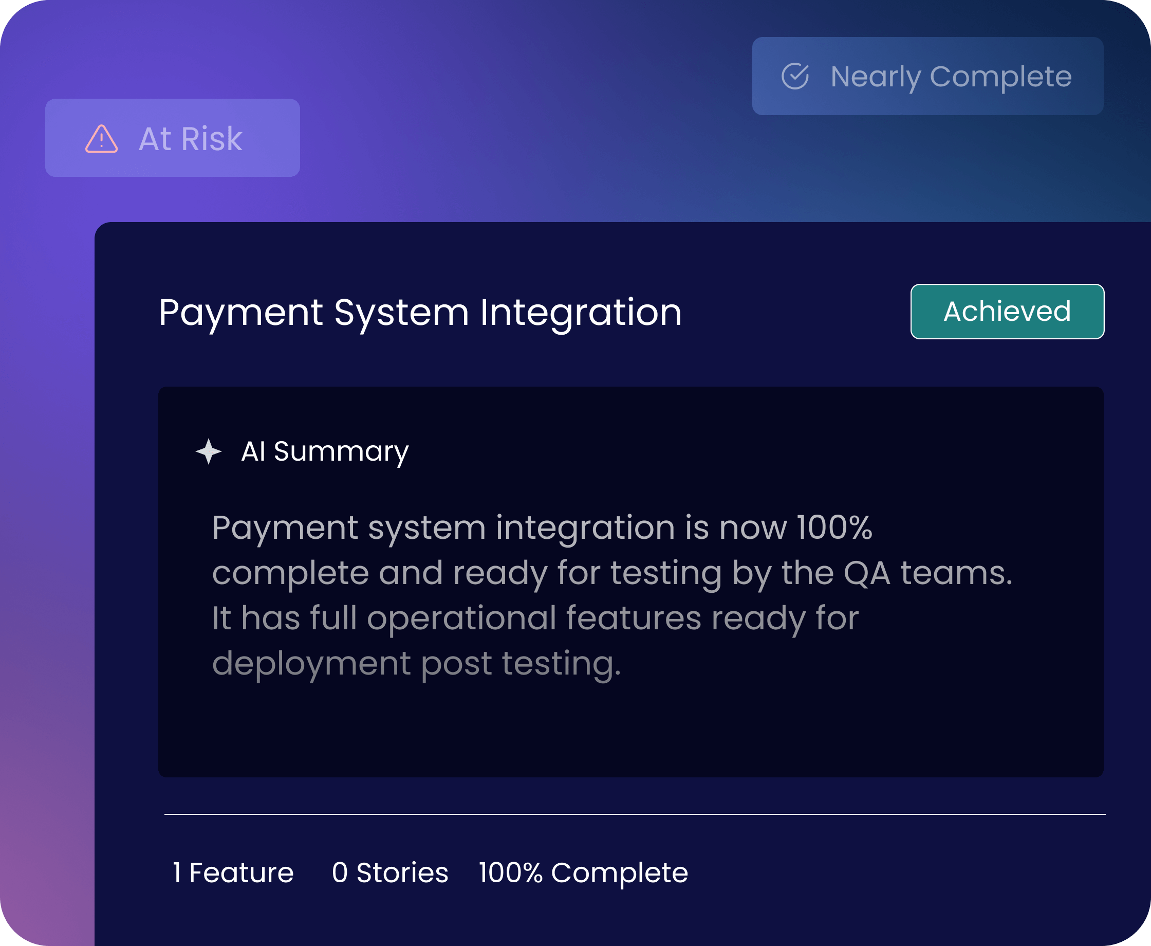Displays each capability as Achieved, Nearly Complete, or At Risk and gives a clear business-level view beyond tickets.